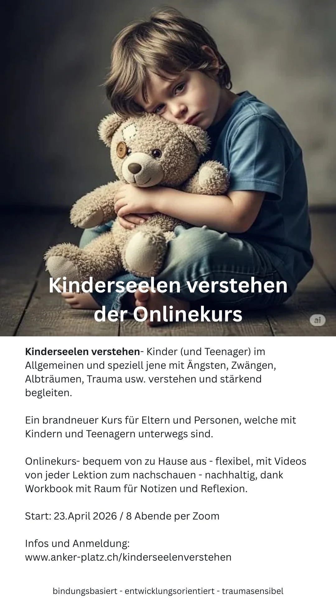 Wenn du dir auch wünschst, gerade Kinder, die Schweres erlebt haben, noch mehr zu verstehen und unterstützen zu können, dann ist der Onlinekurs «Kinderseelen verstehen», der am 23. April wieder startet, etwas für dich. Egal ob du Mama oder Papa bist, Lehrperson, oder eben Leiter/In, du wirst in diesem Kurs ganz viel Verständnis und auch Werkzeuge bekommen und gerade für solche Kinder ein sicheres Umfeld zu gestalten und sie beim heil werden und wachsen zu unterstützen.